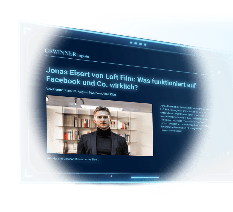 Für eine Zusammenarbeit fülle bitte den Fragebogen auf der Website aus, damit wir ein erstes Bild von deinem Unternehmen bekommen. Anschließend vereinbaren wir ein Erstgespräch. Dort entwickelt einer unserer Marketingexperten bereits ein konkretes Konzept für deinen Loft Film. Er zeigt dir, wie der Film aufgebaut sein sollte und wo er später eingesetzt werden kann, um dir mehr Anfragen zu bringen.KI-Erklärvideo erstellen lassen: So läuft die Produktion ab!